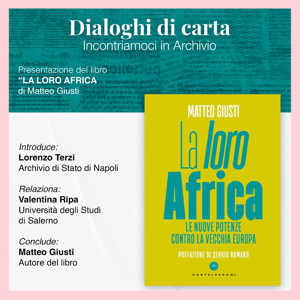 Il 18 febbraio prossimo l’Archivio di Stato di Napoli ha fissato il secondo appuntamento con la rassegna di presentazioni di libri “Dialoghi di carta. Incontriamoci in Archivio”, che si terrà alle ore 11:00 presso la Sala Catasti e dedicato alla presentazione del libro di Matteo Giusti “La loro Africa”.