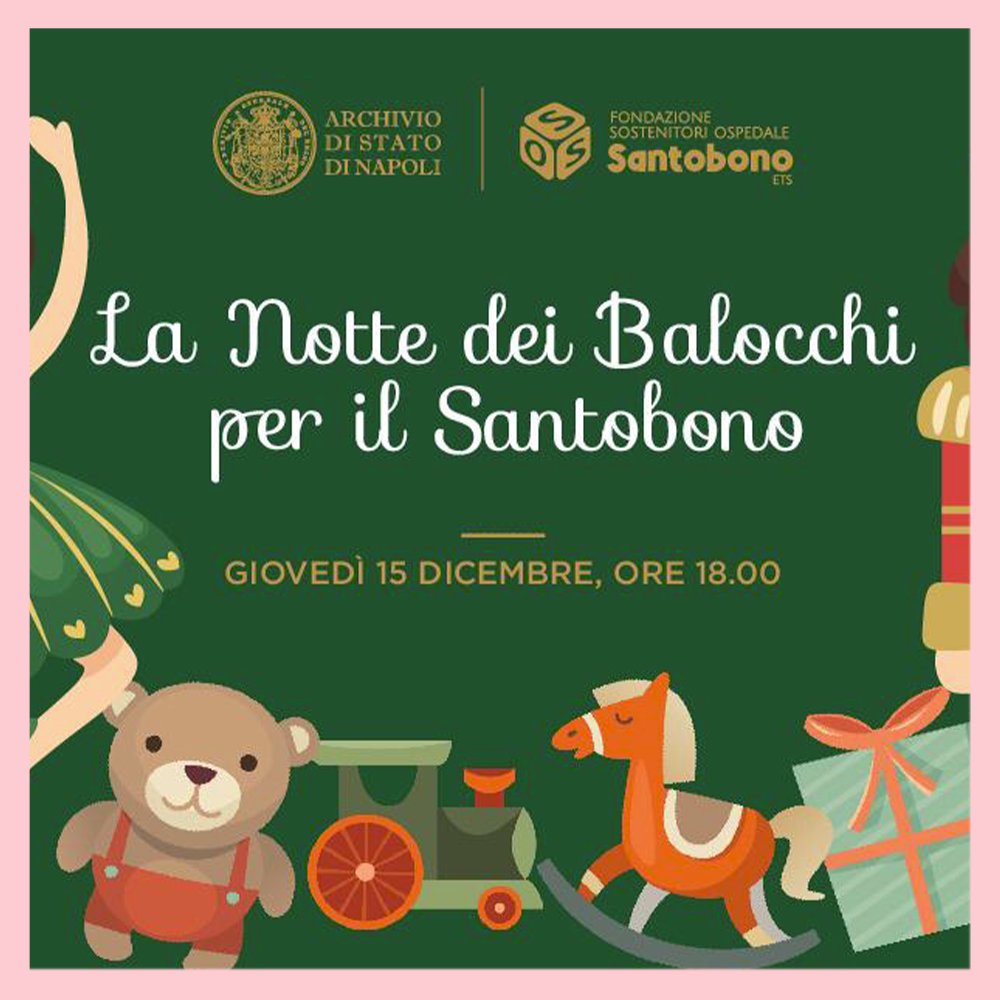 “La Notte dei Balocchi per il Santobono”, presso l’Archivio di Stato di Napoli (Piazzetta Grande Archivio, 5), diretto da Candida Carrino, il prossimo 15 dicembre, a partire dalle 18:00, convoglierà fra le antiche mura dell’ex Monastero dei Santi Severino e Sossio, stakeholder e generosi donatori, sensibili alle più meritevoli cause. Accolgono l’appello della Fondazione Sostenitori Ospedale Santobono ETS, che vogliono continuare a far usufruire i loro piccoli pazienti di una spesso risolutiva pet therapy, in grado di affrettarne i processi di guarigione. Un’eccellenza terapica per il più antico ospedale pediatrico e unico del Mezzogiorno che, per l’occasione, ha elaborato, in partnership con l’Archivio di Stato e la regia di Donatella Dentice d‘Accadia, un evento davvero fantasmagorico.