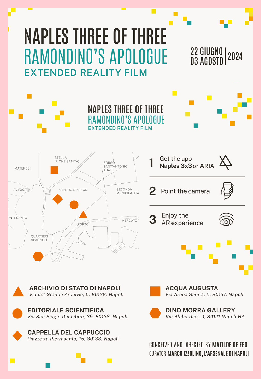 “Il film è stato concepito già in fase drammaturgica per essere visto sui device – spiega Matilde De Feo –. La ricerca è sui concetti di ubiquitous e pervasive computing, su come un film, un contenuto multimediale esplode dallo schermo e può essere nascosto nello spazio e diventare una superficie. Quattro marker colorati costituiscono i quattro nuclei concettuali e cromatici del film: Giallo/Maternità, Azzurro/Mare, Arancione/Utopia politica, isola, Multicolor/La casa. Lo spettatore può interagire con l’opera, rimontare il film secondo una modalità personale e itinerante che ricorda il gioco combinatorio, la libera associazione dadaista cui s’ispira anche Dadapolis, testo storico su Napoli scritto dalla Ramondino in forma di caleidoscopio napoletano, collage e ready made letterario, in “coriandoli della città”.